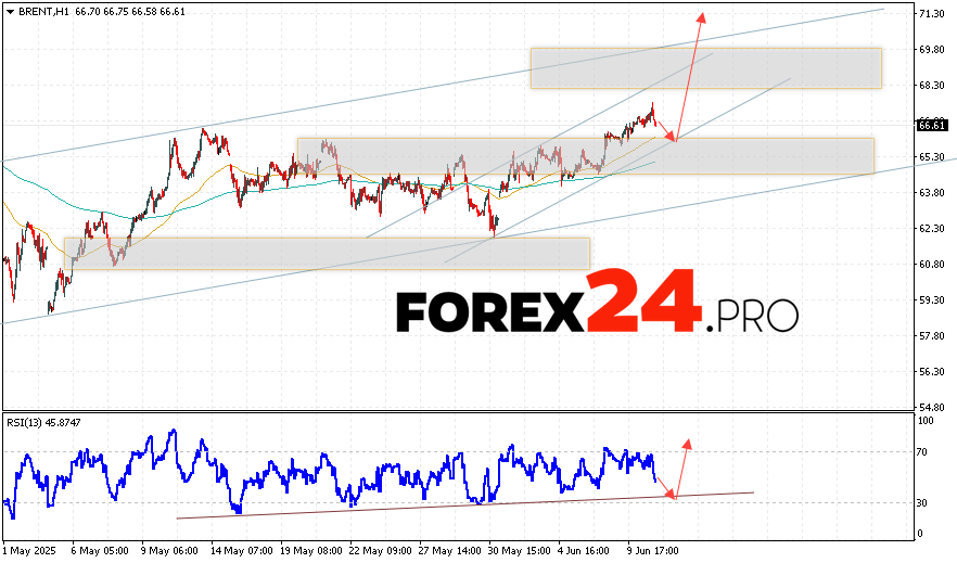 Brent crude oil Forecast for June 11, 2025 suggests an attempt to test the support level near the area of 65.45. Further, the continuation of oil growth with a target above the level of 71.45. A test of the trend line on the relative strength indicator will be in favor of the rise of the asset. Cancellation of the option of growth of Brent oil price will be a fall and breakdown of the level of 64.75. This will indicate the continuation of quotes decline to the area below the level of 56.85.