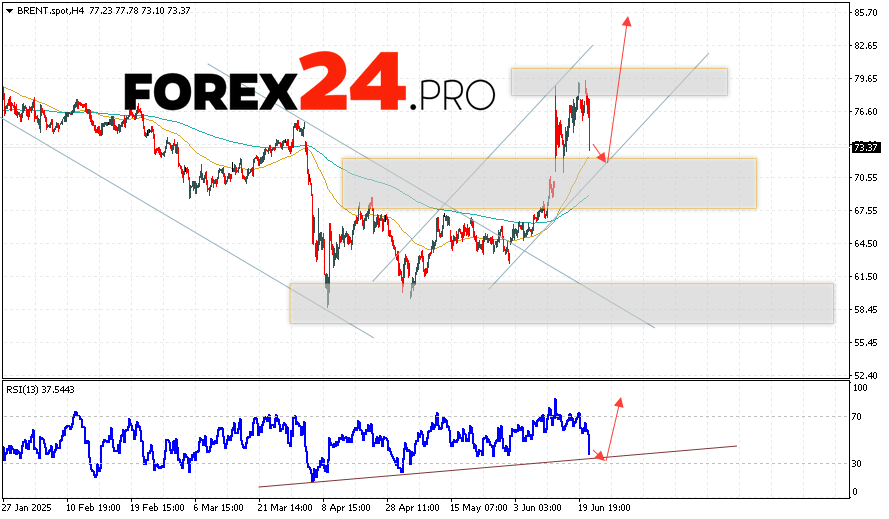 Brent crude oil Forecast for June 24, 2025 suggests an attempt to test the support level near the 70.75 area. Further, oil will continue to rise with a target above the 85.95 level. A test of the trend line on the relative strength indicator will support the asset’s rise. A fall and breakout of the 67.25 level will cancel the Brent oil price growth scenario. This will indicate a continued decline in quotes to below the 60.75 level.