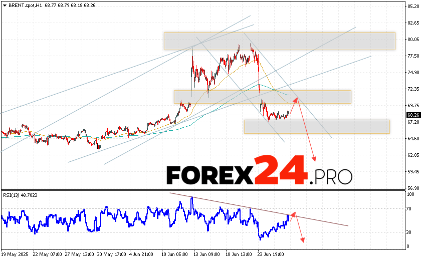 Brent crude oil Forecast for June 27, 2025 suggests an attempt to test the resistance level near the 69.05 area. Further, oil will continue to fall with a target below the 61.65 level. A test of the trend line on the relative strength indicator will support the decline in the asset. A strong rise and a breakout of the 74.35 level will cancel the scenario of a decline in Brent oil prices. This will indicate a continuation of the rise in quotes to the area above the 82.55 level.