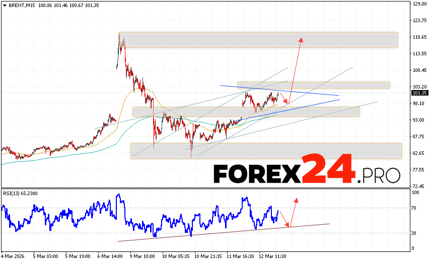 Brent crude oil Forecast for March 13, 2026 suggests an attempt to test the support level near $98.05. Further growth is expected with a target above $118.75. A test of the trend line on the relative strength indicator (RSI) would support the upside. A decline and a break of $92.05 would cancel the upward trend in Brent oil prices. This would indicate a continued decline in prices below $75.65.