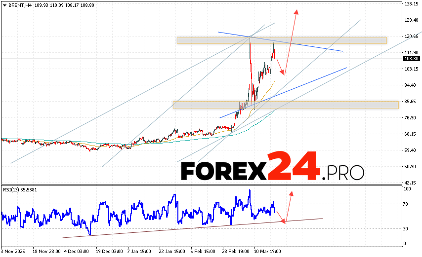 Brent crude oil Forecast for March 20, 2026 suggests an attempt to test the support level near $100.45. Further growth is expected with a target above $132.55. A test of the trend line on the relative strength indicator (RSI) will support the upside. A decline and a breakout of $90.05 will cancel the upward trend in Brent oil prices. This will indicate a continued decline in prices below $75.65.