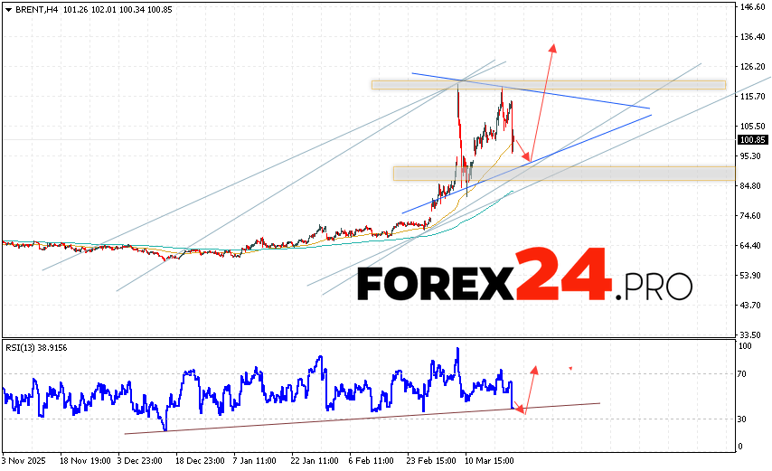 Brent crude oil Forecast for March 24, 2026 suggests an attempt to test the support level near $94.05. Further growth is expected with a target above $136.55. A test of the trend line on the relative strength indicator (RSI) will support the upside. A decline and a breakout of $82.05 will cancel the upward trend in Brent oil prices. This will indicate a continued decline in prices below $70.65.