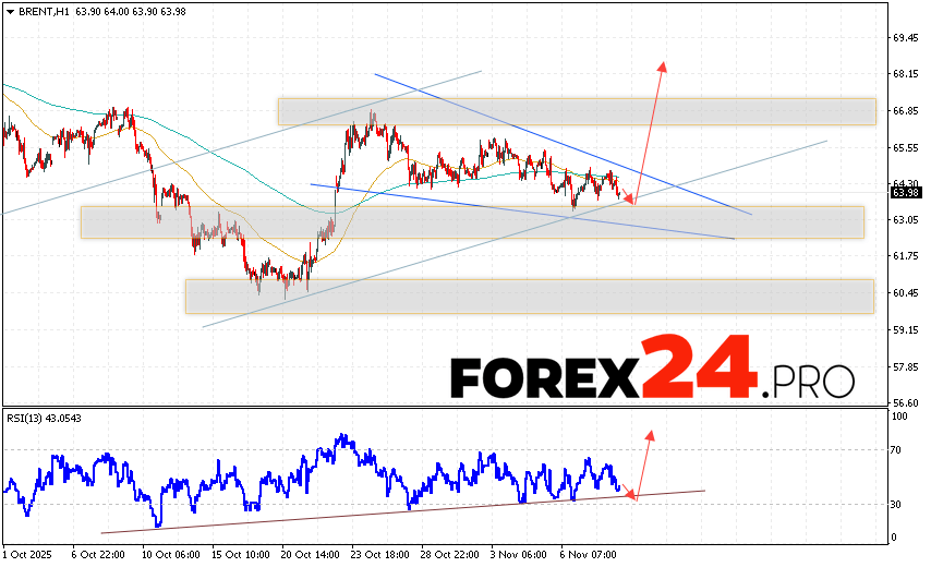 Brent crude oil Forecast for November 11, 2025 suggests an attempt to test the support level near $62.95. Further growth is expected with a target above $68.35. A test of the trend line on the relative strength indicator (RSI) will support the upside. A decline and a breakout of $60.45 will cancel the upward trend in Brent oil prices. This will indicate a continued decline in prices below $55.65.