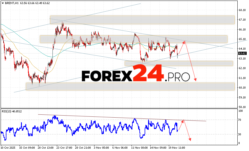 Brent crude oil Forecast for November 21, 2025 suggests an attempt to test the resistance level near $64.35. Further declines are expected with a target below $66.75. A test of the trend line on the relative strength indicator (RSI) would support a downside scenario. A strong rally and a breakout of $60.35 would cancel the Brent price decline scenario. This would indicate a continued rise in prices above $56.65.