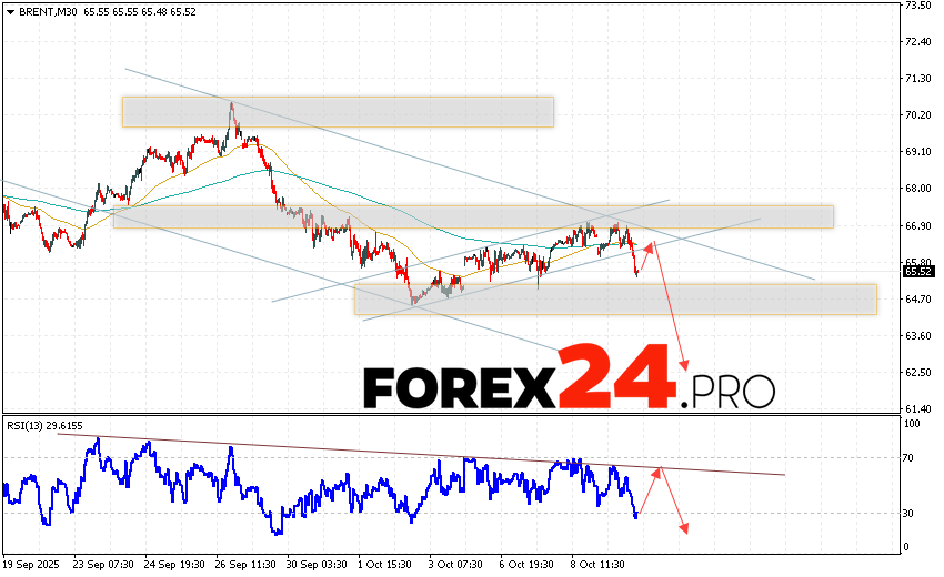 Brent crude oil Forecast for October 10, 2025 suggests an attempt to test the resistance level near $66.55. Further declines are expected with a target below $62.55. A test of the trend line on the relative strength indicator (RSI) would support a downside scenario. A strong rally and a breakout of $68.45 would cancel the Brent price decline scenario. This would indicate a continued rise in prices above $73.75.