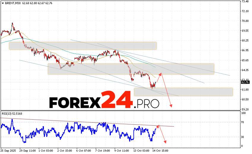 Brent crude oil Forecast for October 15, 2025 suggests an attempt to test the resistance level near $65.35. Further declines are expected with a target below $59.25. A test of the trend line on the relative strength indicator (RSI) would support a downside scenario. A strong rally and a breakout of $67.85 would cancel the Brent price decline scenario. This would indicate a continued rise in prices above $75.05.