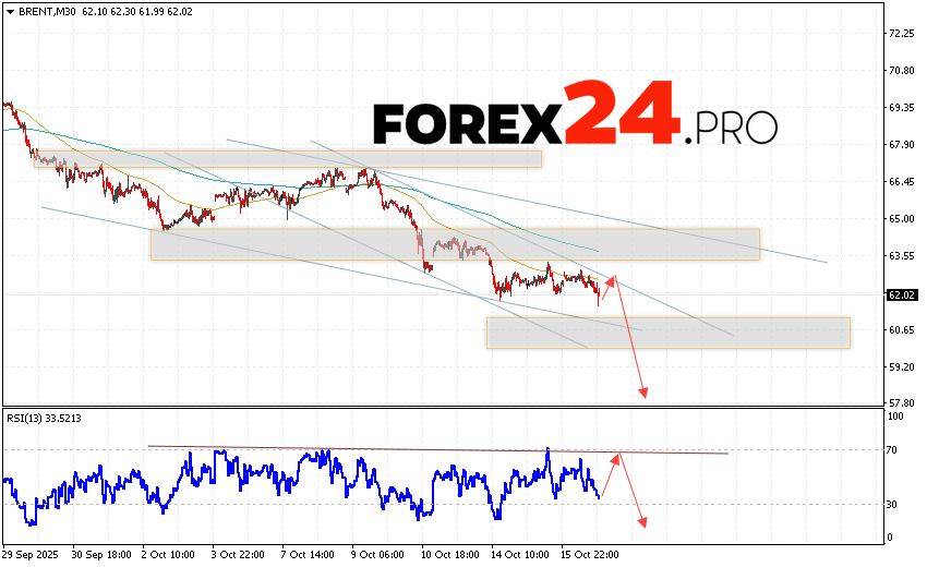 Brent crude oil Forecast for October 17, 2025 suggests an attempt to test the resistance level near $62.55. Further declines are expected with a target below $57.85. A test of the trend line on the relative strength indicator (RSI) would support a downside scenario. A strong rally and a breakout of $65.05 would cancel the Brent price decline scenario. This would indicate a continued rise in prices above $70.45.