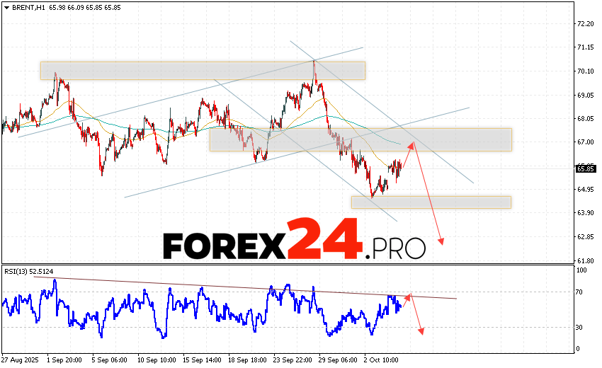 Brent crude oil Forecast for October 7, 2025 suggests an attempt to test the resistance level near $66.85. Further declines are expected with a target below $62.45. A test of the trend line on the relative strength indicator (RSI) would support a downside scenario. A strong rally and a breakout of $68.65 would cancel the Brent price decline scenario. This would indicate a continued rise in prices above $75.05.