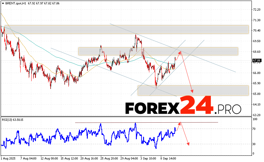 Brent crude oil Forecast for September 12, 2025 suggests an attempt to test the resistance level near the area of 68.65. Further, the continuation of the fall of oil with a target below the level of 65.15. A test of the trend line on the relative strength indicator will be in favor of a decrease in the asset. The cancellation of the option for falling Brent oil prices will be a strong growth and a breakout of the level of 69.65. This will indicate continued growth of quotes to the area above the level of 75.45.