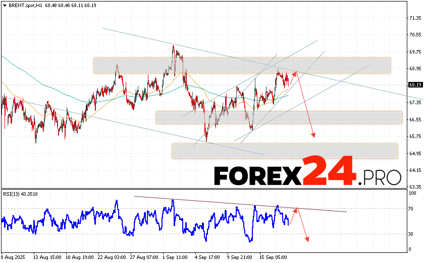 Brent crude oil Forecast for September 18, 2025 suggests an attempt to test the resistance level near $68.75. Further declines are expected with a target below $65.65. A test of the trend line on the relative strength indicator (RSI) would support the asset’s growth. A strong rally and a breakout of $69.75 would cancel the Brent price decline scenario. This would indicate continued growth in prices above $73.65.