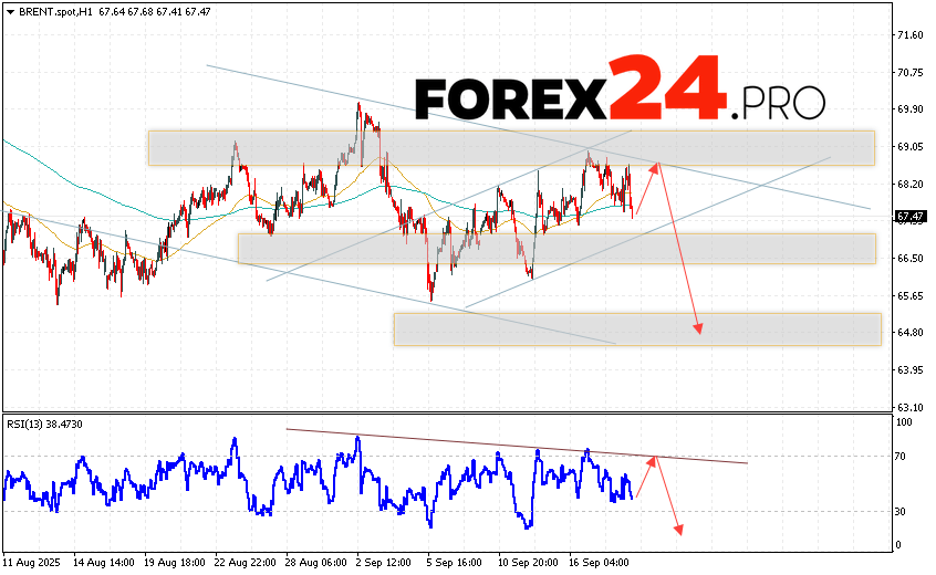 Brent crude oil Forecast for September 19, 2025 suggests an attempt to test the resistance level near $68.65. Further declines are expected with a target below $65.05. A test of the trend line on the relative strength indicator (RSI) would support the asset’s growth. A strong rally and a breakout of $69.85 would cancel the Brent price decline scenario. This would indicate continued growth in prices above $73.65.