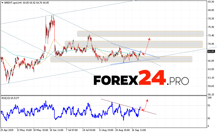 Brent crude oil Forecast for September 25, 2025 suggests an attempt to test the support level near $68.05. Further growth is expected with a target above $72.55. A test of the trend line on the relative strength indicator (RSI) would support the asset’s growth. A decline and breakout of $63.05 would cancel the upward price scenario for Brent. This would indicate a continued decline in prices below $55.65.