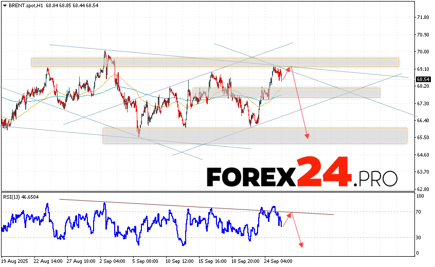 Brent crude oil Forecast for September 26, 2025 suggests an attempt to test the resistance level near $69.05. Further declines are expected with a target below $65.50. A test of the trend line on the relative strength indicator (RSI) would support a downside move. A strong rally and a breakout of $70.25 would cancel the Brent price decline scenario. This would indicate a continued rise in prices above $75.05.