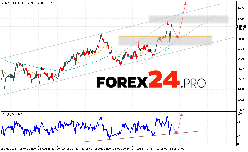Brent crude oil Forecast for September 3, 2025 suggests an attempt to test the support level near the area of 68.05. Further, the continuation of oil growth with a target above the level of 71.85. The test of the trend line on the relative strength indicator will be in favor of the asset growth. The cancellation of the Brent oil price rise scenario will be a fall and a breakout of the level of 67.45. This will indicate a continuation of the decline in quotes to the area below the level of 61.45.