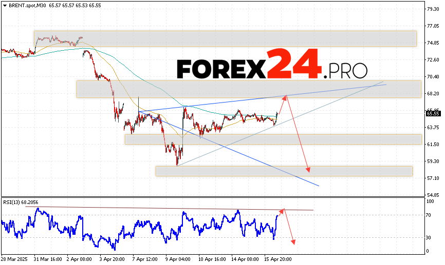 Brent Forecast for April 17, 2025 suggests an attempt to test the resistance level near the 68.05 area. Further, the continuation of the fall in oil with a target below 57.45. A test of the trend line on the relative strength indicator will be in favor of the asset’s fall. The cancellation of the Brent oil price decline scenario will be a strong growth and a breakout of 70.55. This will indicate a continuation of the rise in quotes to the area above the level of 75.75.