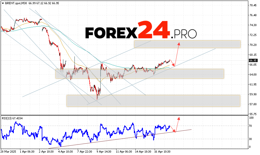 Brent Forecast for April 18, 2025 suggests an attempt to test the support level near the area of 65.85. Further, the continuation of oil growth with a target above the level of 70.25. The growth of the asset will be supported by a test of the trend line on the relative strength indicator. The cancellation of the growth option for Brent oil prices will be a fall and a breakout of the level of 63.05. This will indicate a continuation of the fall in quotes to the area below the level of 58.45.