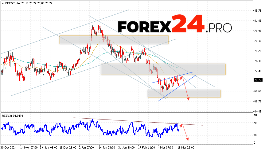 Brent Forecast for March 20, 2025 suggests an attempt to test the resistance level near the 71.45 area. Further, the continuation of the fall of oil with a target below the level of 66.75. A test of the trend line on the relative strength indicator will be in favor of the fall of the asset. Cancellation of the option of a decrease in the price of Brent oil will be a strong growth and a breakout of the level of 74.45. This will indicate a continuation of the rise in quotes to the area above 82.35.