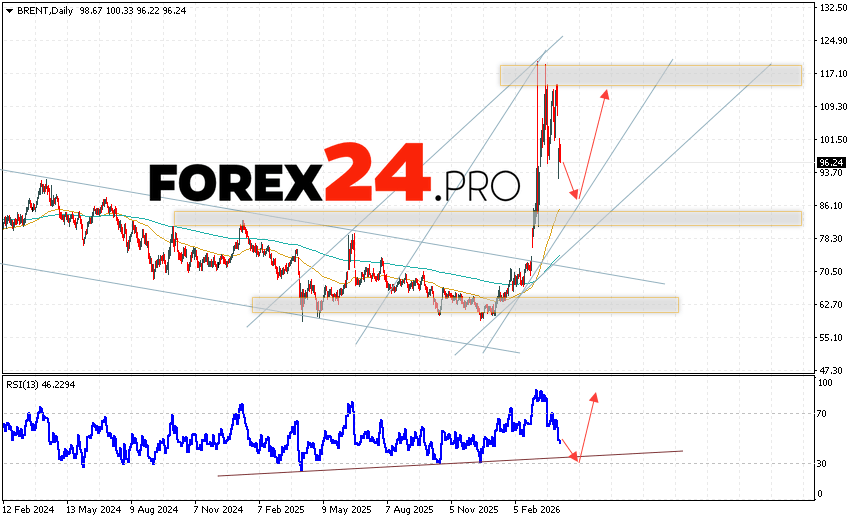 Brent Weekly Forecast April 13 – 17, 2026 suggests an attempt to test the support area near $87.05. From here, we should expect a rebound and an attempt to continue the oil price rise, with a potential target at 115.05. An additional signal in favor of oil price growth would be a test of the trend line on the relative strength indicator. A price decline and a break of the 75.05 area would cancel out the upward trend. This would indicate a break of the support area and a continued decline in oil prices, with a target below 65.05.