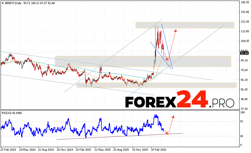 Brent Weekly Forecast April 20 – 24, 2026 suggests an attempt to test the support area near 86.25. From there, a rebound and a continued rally with a potential target of 115.25 should be expected. An additional signal favoring oil price growth would be a test of the trend line on the relative strength indicator (RSI). A price decline and a break of 74.05 would invalidate this upward trend. This would indicate a break of the support area and a continued decline with a target below 60.65.