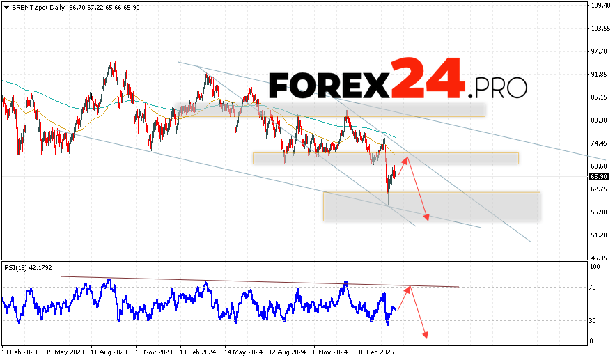 Brent Weekly Forecast April 28, 2025 — May 2, 2025 suggests an attempt to test the resistance area near the 67.05 level. From where we should expect a rebound and an attempt to continue the fall of oil with a potential target at the level of 55.85. An additional signal in favor of a decrease in oil prices will be a test of the trend line on the relative strength indicator. The cancellation of the scenario of a fall will be a strong growth in price and a breakout of the 75.05 area. This will indicate a breakout of the resistance area and continued growth of oil prices with a target above the 80.65 level.
