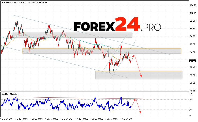 Brent Weekly Forecast August 18 — 22, 2025 suggests an attempt to test the resistance area near the 70.25 level. From there, a rebound and an attempt to continue the decline in oil prices should be expected, with a potential target at 55.65. An additional signal in favor of a decline in oil prices will be a test of the trend line on the relative strength indicator. A strong price increase and a breakout of the 79.25 area will cancel the decline scenario. This will indicate a breakout of the resistance area and a continuation of oil price growth with a target above the 85.75 level.