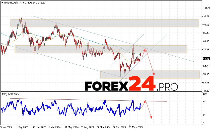 Brent Weekly Forecast August 4 — 8, 2025 suggests an attempt to test the resistance area near the 75.05 level. From there, a rebound and an attempt to continue the decline in oil prices should be expected, with a potential target at 59.65. An additional signal in favor of a decline in oil prices will be a test of the trend line on the relative strength indicator. A strong price increase and a breakout of the 80.55 area will cancel the decline scenario. This will indicate a breakout of the resistance area and a continuation of oil price growth with a target above the 86.05 level.