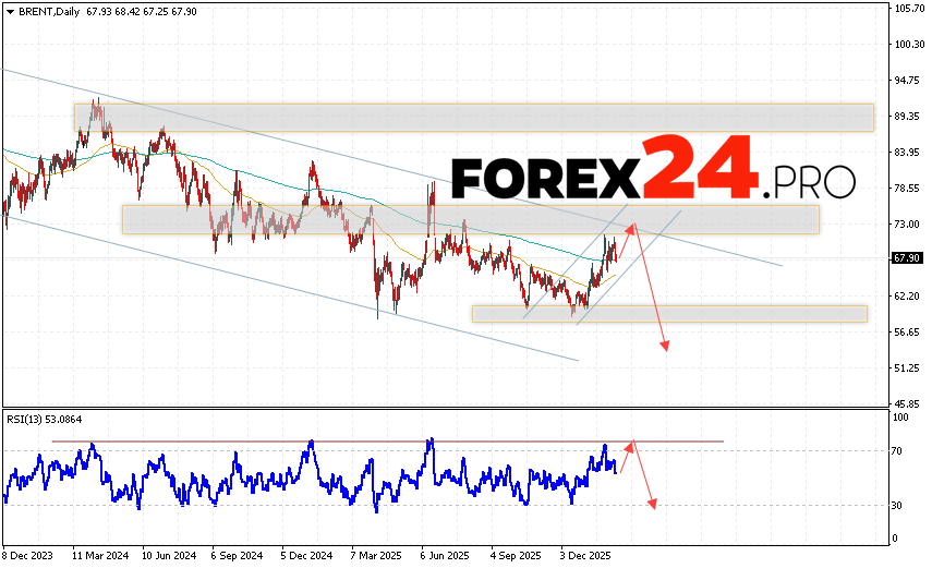 Brent Weekly Forecast February 16 – 20, 2026 suggests an attempt to test the resistance area near 71.75. From there, a rebound and a further decline with a potential target of 55.65 should be expected. An additional signal favoring a decline in oil prices will be a test of the trend line on the relative strength indicator. A strong rise and a breakout of 76.75 will cancel the downward trend. This will indicate a breakout of the resistance area and a continuation of the rise in oil prices with a target above the level of 83.65.