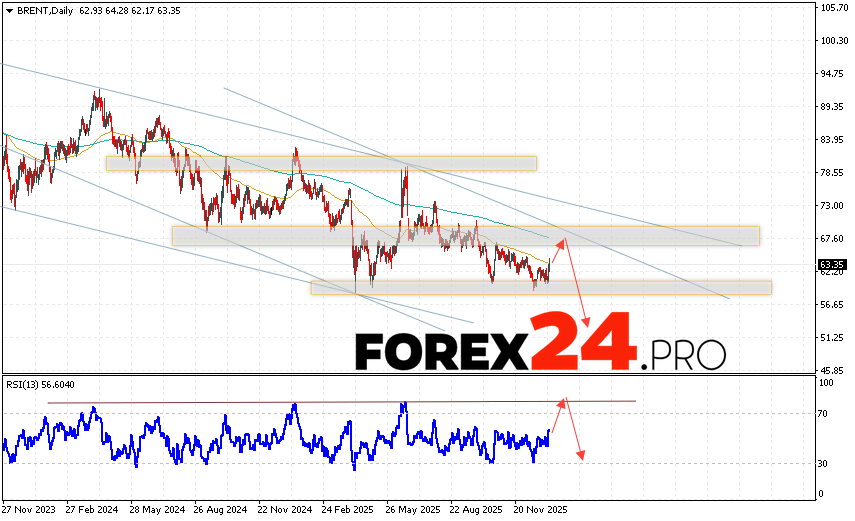 Brent Weekly Forecast January 12 – 16, 2026 suggests an attempt to test the resistance area near 66.45. From there, a rebound and a continued decline with a potential target of 52.75 should be expected. A test of the trend line on the relative strength indicator (RSI) would also signal a decline. A strong rally and a breakout of 72.05 would cancel the downward price scenario. This would indicate a breakout of the resistance area and continued price growth with a target above 78.25.