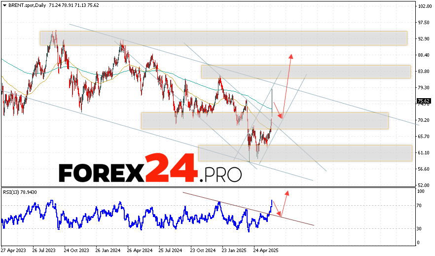 Brent Weekly Forecast June 16 — 20, 2025 suggests an attempt to test the support area near the $70.20 level. From there, we can expect a rebound and an attempt to continue growing oil prices, with a potential target of 88.45. An additional signal favoring an increase in oil prices will be testing the trend line on the relative strength indicator. A fall in price and a breakout of the 65.05 area will cancel the growth scenario. This would indicate a breakout of the support area and a continuation of the decline in oil prices, with a target below the $58.65 level.