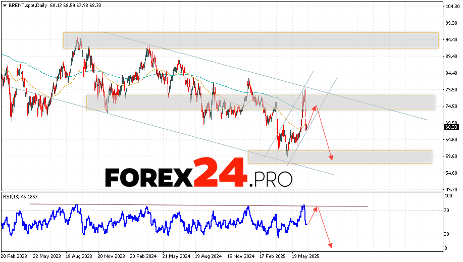 Brent Weekly Forecast June 30 — July 4, 2025 suggests an attempt to test the resistance area near the 73.55 level. From there, a rebound and an attempt to continue the decline in oil prices should be expected, with a potential target at 60.05. An additional signal in favor of a decline in oil prices will be a test of the trend line on the relative strength indicator. A strong price increase and a breakout of the 82.05 area will cancel the decline scenario. This will indicate a breakout of the resistance area and a continuation of oil price growth with a target above the 87.45 level.