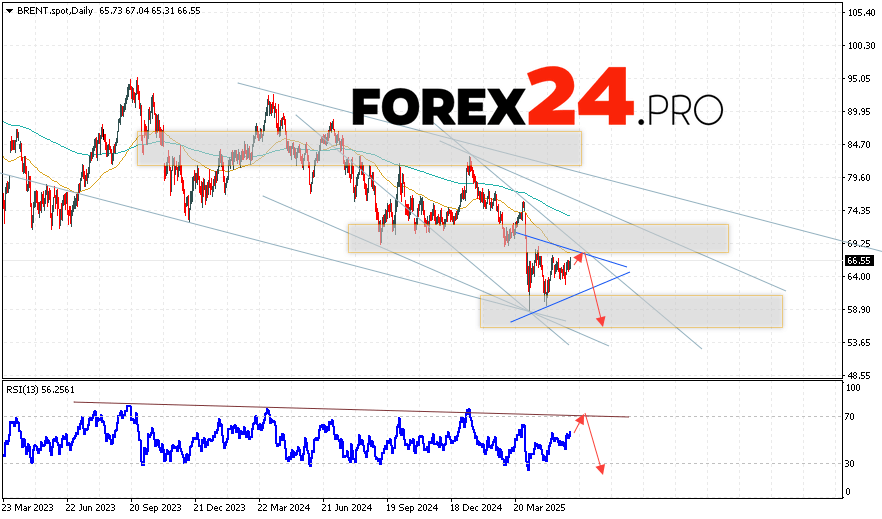 Brent Weekly Forecast June 9 — 13, 2025 suggests an attempt to test the resistance area near the 67.95 level. From there, we can expect a rebound and an attempt to continue the decline in oil prices with a potential target at 54.05. An additional signal in favor of a decline in oil prices will be a test of the trend line on the relative strength indicator. A strong price increase and a breakout of the 72.05 area will cancel the decline scenario. This will indicate a breakout of the resistance area and a continuation of oil price growth with a target above the 78.45 level.