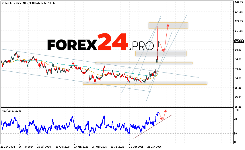 An additional signal favoring a decline in oil prices this week will be a test of the support line on the relative strength indicator. A second signal will be a rebound from the lower boundary of the bullish channel. A decline and a break of 76.75 would cancel out the upward trend in BRENT oil prices and quotes during the trading week of March 16-20, 2026. This would indicate a break of the support area and a continuation of the decline in oil prices below 65.75. Confirmation of the upside is expected with a break of the resistance area and a close above 106.55.
