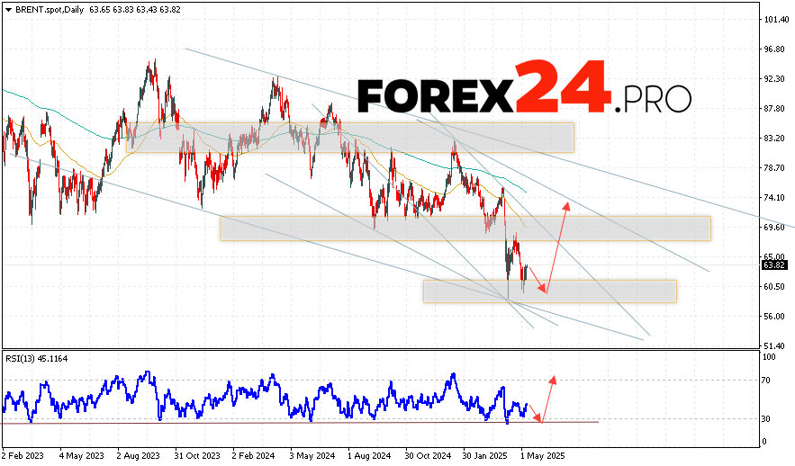 Brent Weekly Forecast May 12 — 16, 2025 suggests an attempt to test the support area near the 59.45 level. Where should we expect a rebound and an attempt to continue the growth of oil with a potential target at the level of 71.05. An additional signal in favor of the rise in oil prices will be a test of the trend line on the relative strength indicator. The cancellation of the growth option will be a price drop and a breakout of the 55.45 area. This will indicate a breakout of the support area and a continuation of the decline in oil prices with a target below the 50.05 level.