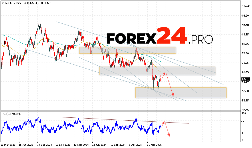 Brent Weekly Forecast May 19 — 23, 2025 anticipates a test of the resistance area close to the level of 67.65. A rebound and continuation of oil price decline are expected with a potential target at the level of 55.05. An additional signal towards lower oil prices is a test of the trend line on the Relative Strength Index (RSI) indicator. Cancellation of the drop scenario would be characterized by strong price growth and breaking through the area of 72.55. This would indicate a break above the resistance area and an increase in the oil price with a target above the level of 78.05.