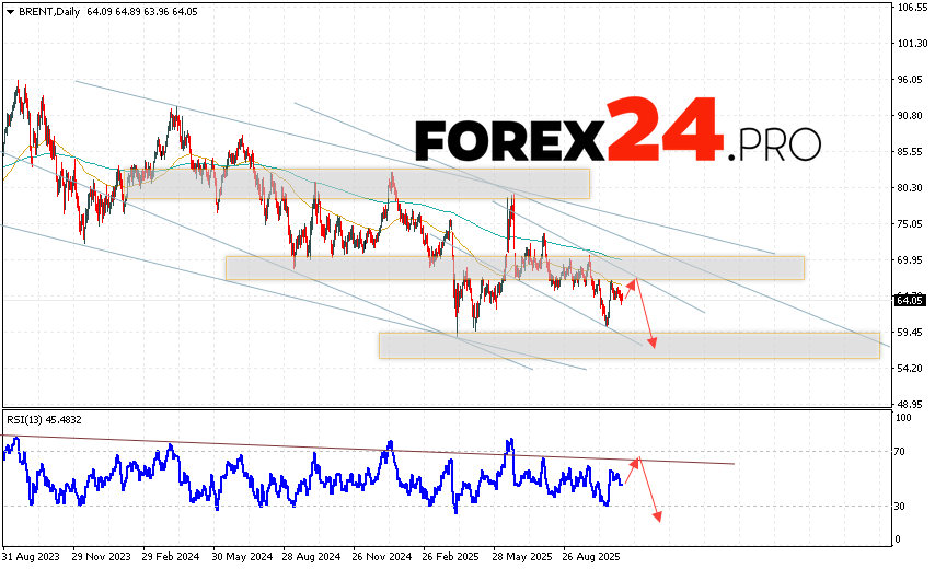 Brent Weekly Forecast November 10 – 14, 2025 suggests an attempt to test the resistance area near 66.45. From there, a rebound and a continued decline in oil prices with a potential target of 57.65 should be expected. An additional signal favoring a decline in oil prices would be a test of the trend line on the relative strength indicator (RSI). A strong price increase and a breakout of 71.65 would invalidate this downward scenario. This would indicate a breakout of the resistance area and a continued rise in oil prices with a target above 76.85.