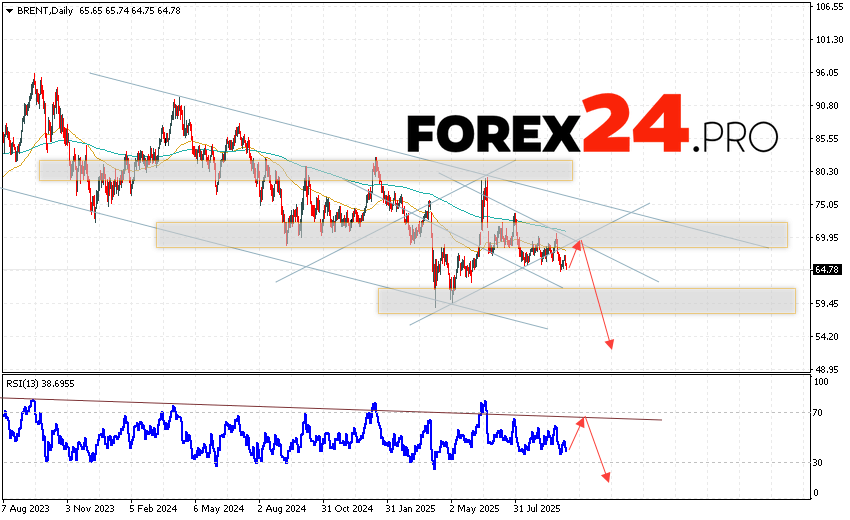 Brent Weekly Forecast October 13 – 17, 2025 suggests an attempt to test the resistance area near 68.65. From here, we should expect a rebound and an attempt to continue the decline in oil prices, with a potential target at 53.45. A test of the trend line on the relative strength indicator (RSI) would be an additional signal of a decline in oil prices. A strong price increase and a breakout of 76.55 would cancel this downward scenario. This would indicate a breakout of the resistance area and continued price growth with a target above 85.65.