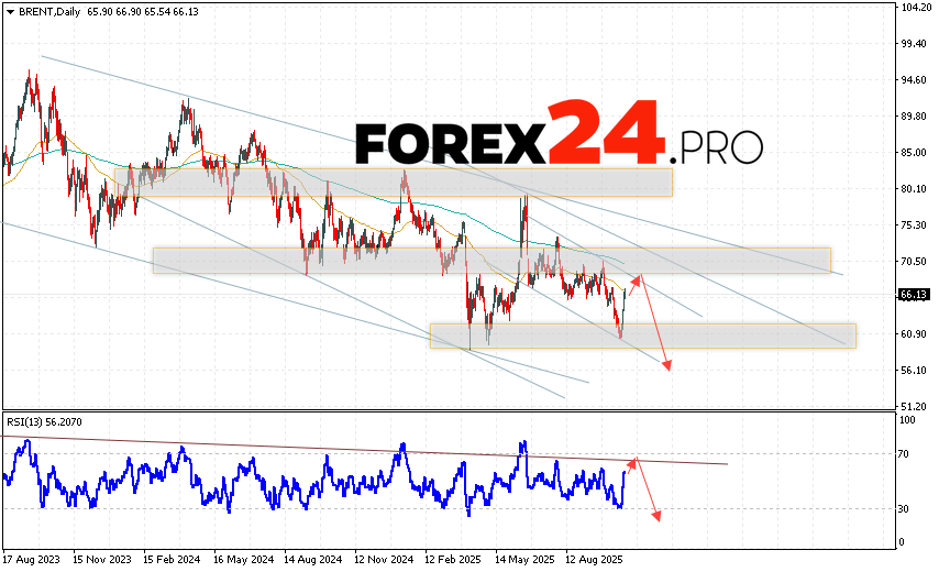 Brent Weekly Forecast October 27 – 31, 2025 suggests an attempt to test the resistance area near 68.05. From there, a rebound and a continued decline with a potential target of 56.15 should be expected. An additional signal favoring a decline in oil prices will be a test of the trend line on the relative strength indicator. A strong rise and a breakout of 74.65 will cancel the downward scenario. This will indicate a breakout of the resistance area and continued price growth with a target above 82.55.