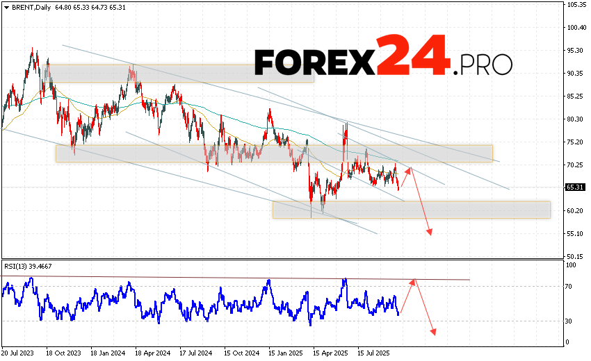 Brent Weekly Forecast October 6 — 10, 2025 suggests an attempt to test the resistance area near 68.55. From there, a rebound and a continued decline in oil prices with a potential target of 55.15 are expected. An additional signal favoring a decline in oil prices would be a test of the trend line on the relative strength indicator (RSI). A strong price increase and a breakout of 76.55 would invalidate this downward scenario. This would indicate a breakout of the resistance area and continued price growth with a target above 85.65.