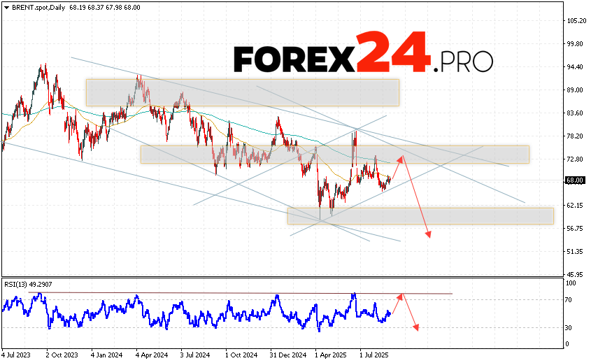 Brent Weekly Forecast September 1 — 5, 2025 suggests an attempt to test the resistance area near the 72.35 level. From where we should expect a rebound and an attempt to continue the fall of oil with a potential target at the level of 55.05. An additional signal in favor of a decrease in oil prices will be a test of the trend line on the relative strength indicator. The cancellation of the scenario of a fall will be a strong growth in price and a breakout of the 79.45 area. This will indicate a breakout of the resistance area and continued growth of oil prices with a target above the 86.55 level.