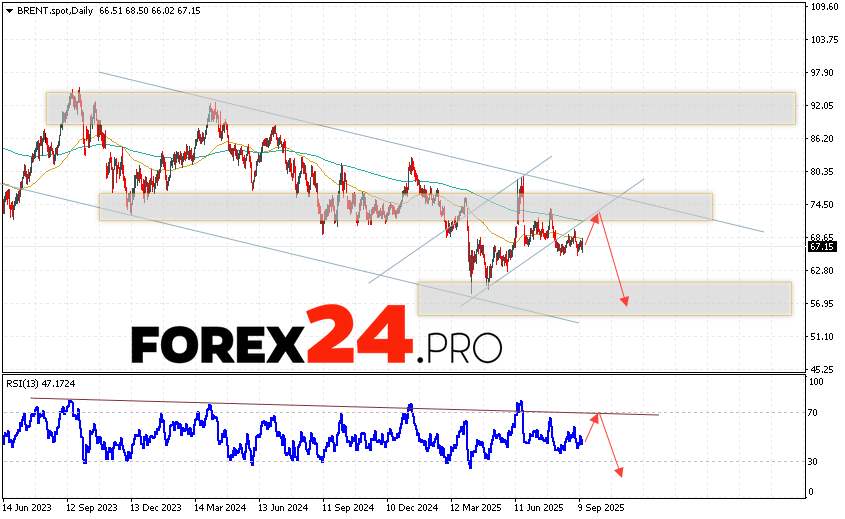 Brent Weekly Forecast September 15 – 19, 2025 suggests an attempt to test the resistance area near the 71.75 level. From where we should expect a rebound and an attempt to continue the fall of oil with a potential target at the level of 57.05. An additional signal in favor of a decrease in oil prices will be a test of the trend line on the relative strength indicator. The cancellation of the scenario of a fall will be a strong growth in price and a breakout of the 79.45 area. This will indicate a breakout of the resistance area and continued growth of oil prices with a target above the 86.75 level.