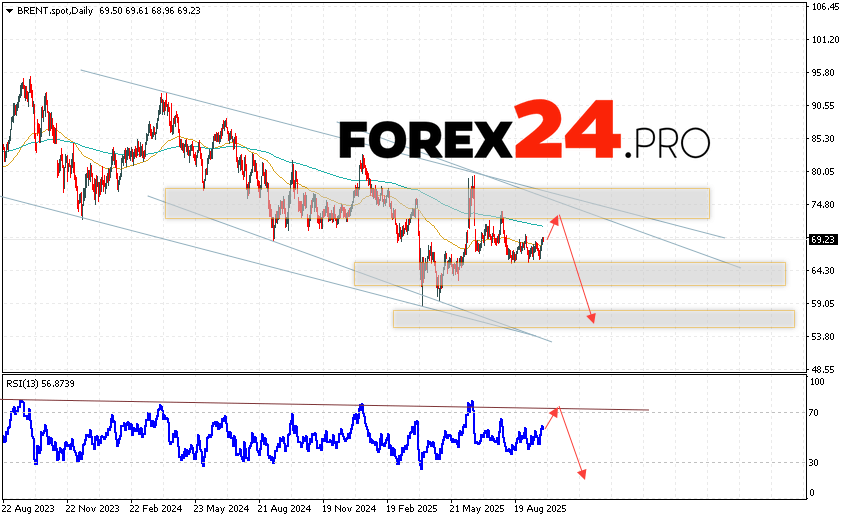 Brent Weekly Forecast September 29 — October 3, 2025 suggests an attempt to test the resistance area near 71.45. From there, a rebound and a continued decline with a potential target of 57.65 should be expected. A test of the trend line on the relative strength indicator (RSI) would also signal a decline. A strong rally and a breakout of 79.05 would cancel the downward scenario. This would indicate a breakout of the resistance area and continued price growth with a target above 85.65.
