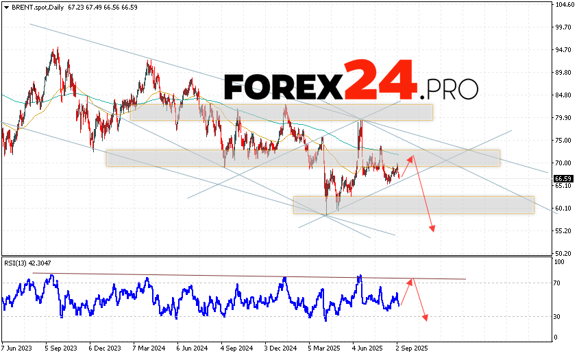 Brent Weekly Forecast September 8 – 12, 2025 suggests an attempt to test the resistance area near the 70.65 level. From where we should expect a rebound and an attempt to continue the fall of oil with a potential target at the level of 55.35. An additional signal in favor of a decrease in oil prices will be a test of the trend line on the relative strength indicator. The cancellation of the scenario of a fall will be a strong growth in price and a breakout of the 78.65 area. This will indicate a breakout of the resistance area and continued growth of oil prices with a target above the 86.55 level.