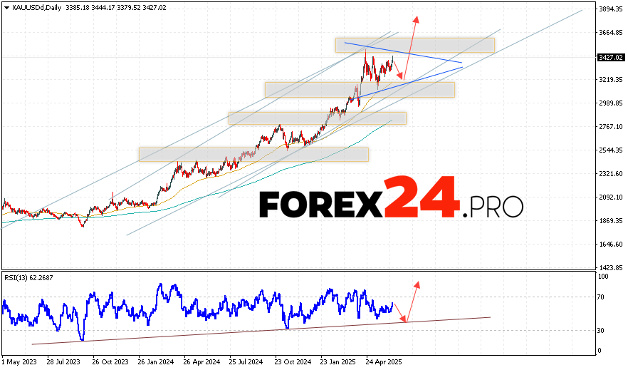 GOLD Weekly Forecast XAUUSD June 16 — 20, 2025 suggests an attempt at a bearish correction and a test of the support level near the 3245 area. Then, the price of gold will rise further, with a target above the 3775 level. Testing the trend line on the relative strength indicator will support the rise in quotes. A fall below the 3035 level will cancel the growth scenario for gold. This would indicate a continuation of the decline in prices to the area below the 2,735 level.