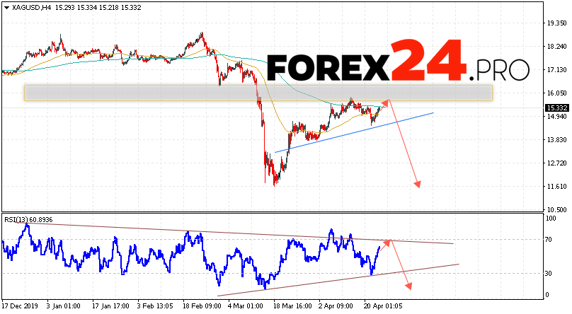 XAG/USD Forecast Silver and Analysis April 24, 2020 suggests an attempt to test the resistance area near the level of 15.55. Further, the continuation of the fall of quotations with the target below the level of 11.65. Cancellation of the option of reducing the price of Silver will be a strong growth and the breakdown of the level of 16.25. This will indicate a breakdown of the resistance level. In this case, we should expect the continuation of the rise in prices above the level of 18.05.