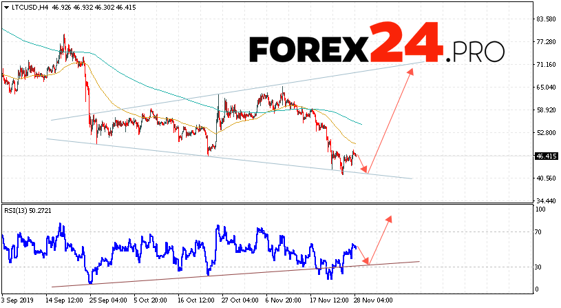 Litecoin Forecast and LTC/USD Analysis November 29, 2019 implies an attempt to correct and test the support area near the level of 42.55. Where can we expect a rebound and continued growth of LTC/USD to the area above the level of 71.15. An additional signal in favor of raising Litecoin will be a test of the trend line on the relative strength index (RSI). Cancellation of the growth option will be a fall and a breakdown of the area of 37.05. This will indicate a continued decline in cryptocurrency with a target below the level of 25.05.
