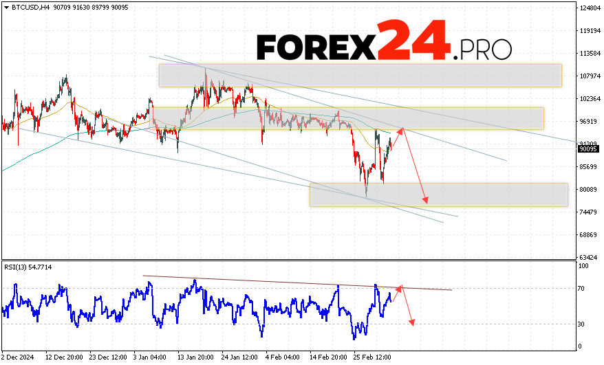 Bitcoin Forecast and Analysis for March 7, 2025 suggests an attempt to test the resistance level near the 91665 area. And then, the continuation of the fall of the cryptocurrency with a potential target at 75605. An additional signal in favor of the fall of the Bitcoin rate will be a test of the resistance line on the relative strength indicator. The cancellation of the option of falling digital currency will be a breakout of the 97765 area. This will indicate continued growth of the coin with a potential target above 103505.