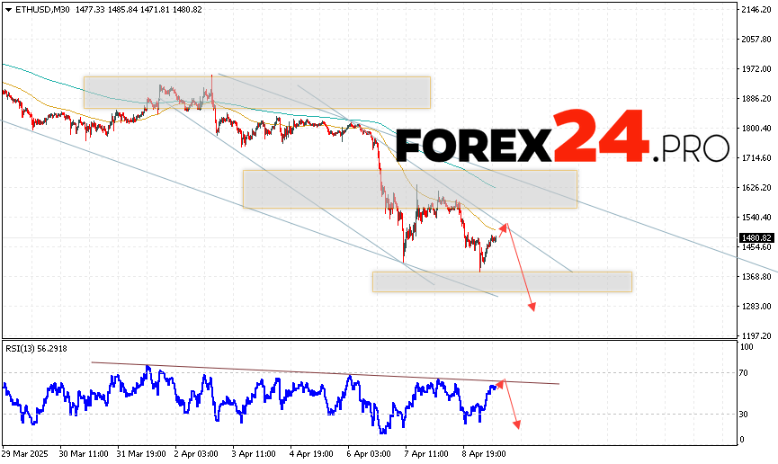 Ethereum Forecast and Analysis for April 10, 2025 suggests an attempt at a bullish correction and a test of the resistance area near the 1585 level. Where should we expect a rebound and continued fall of the ETH/USD cryptocurrency to the area below the 1275 level. An additional signal in favor of a decline in Ethereum will be a test of the trend line on the relative strength indicator. The cancellation of the digital currency fall option will be a breakout of the 1645 area. Which will indicate continued growth of the digital currency with a potential target above the 2165 level.