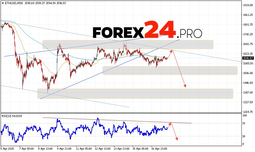 Ethereum Forecast and Analysis for April 18, 2025 implies an attempt by bull correction and the resistance test area near the level of 1645. Where to expect a rebound and continuation of the ETH/USD cryptocurrency fall into the area below the level of 1405. An additional signal in favor of a decrease in Ethereum will be the trend on the relative force indicator. The cancellation of the option of falling digital currency will be the breakdown of the area 1765. Which will indicate the continuation of the growth of the digital currency with a potential target above level 2205.