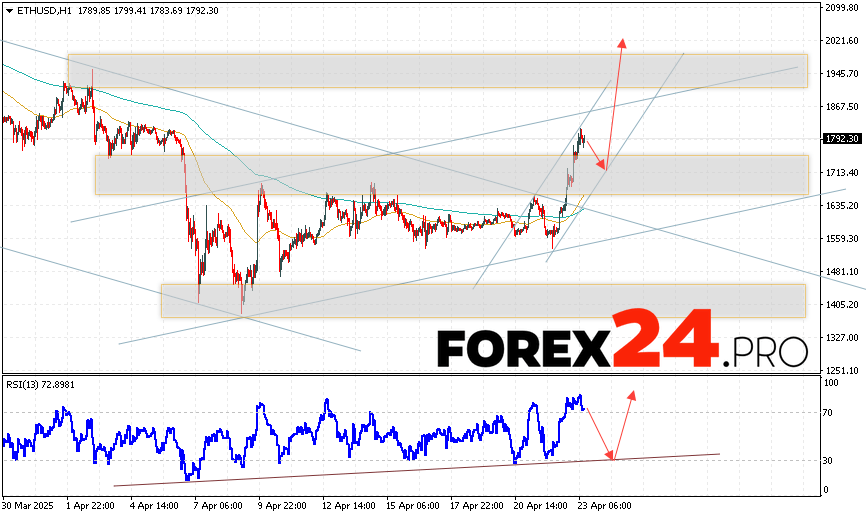 Ethereum Forecast and Analysis for April 24, 2025 suggests an attempt at a bullish correction and a test of the support area near the level of 1715. Where should we expect a rebound and continued growth of the ETH/USD cryptocurrency to the area above the level of 2025. An additional signal in favor of the rise of Ethereum will be a test of the trend line on the relative strength indicator. The cancellation of the growth option for the digital currency will be a breakdown of the 1615 area. Which will indicate a continued fall of the digital currency with a potential target below the level of 1245.