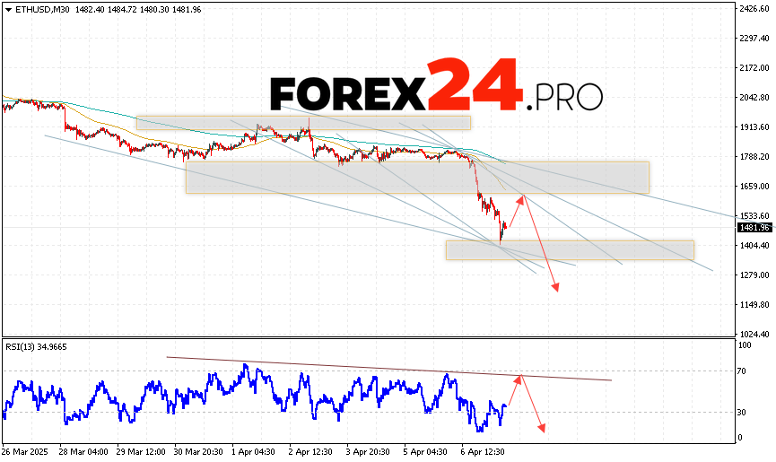 Ethereum Forecast and Analysis for April 8, 2025 suggests an attempt at a bullish correction and a test of the resistance area near the 1665 level. Where should we expect a rebound and continued fall of the ETH/USD cryptocurrency to the area below the 1245 level. An additional signal in favor of a decline in Ethereum will be a test of the trend line on the relative strength indicator. The cancellation of the digital currency fall option will be a breakout of the 1865 area. Which will indicate continued growth of the digital currency with a potential target above the 2435 level.